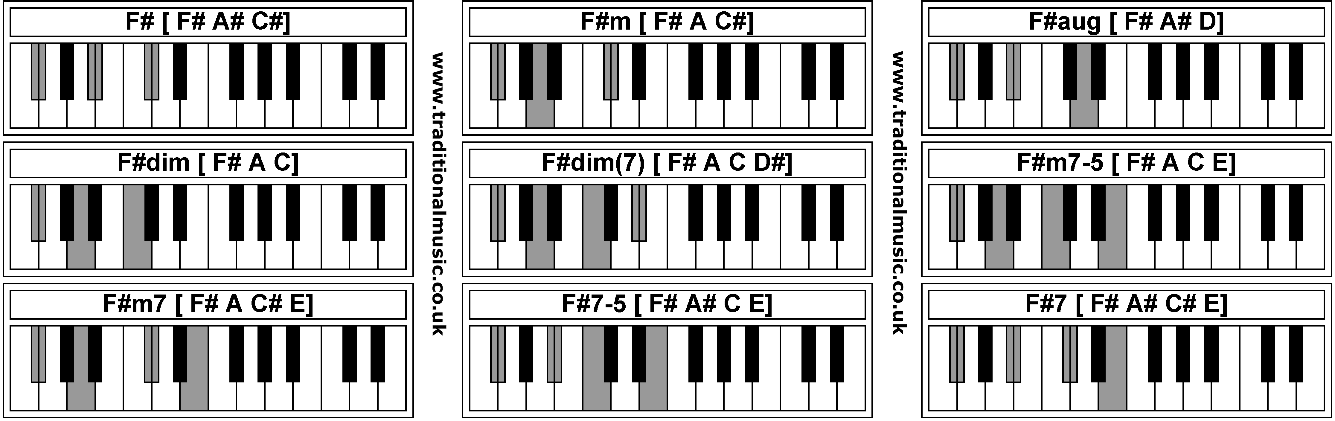 All piano chords contain a root note this is the note the chord is named after as well as one or more additional notes Basic piano chords often consist of only two or three notes, while the more advanced chords tend to incorporate even more notes The most common type of keyboard or piano chord is a triad, or threenote chordF#aug, F# augmented, F# Piano Chord Gbaug, Gb augmented, Gb PianoF#aug7 Chord Below you can find chord diagrams, piano fingerings, guitar fingering, notes, intervals, scales, and arpeggiosAdditionally, you can Download our Piano Companion FREE app which is used by millions of users worldwide and contains more than 10,000 chords and scales F#7, F#7♯5, F#75, F# aug7 Notes F♯, A♯, Cx, E